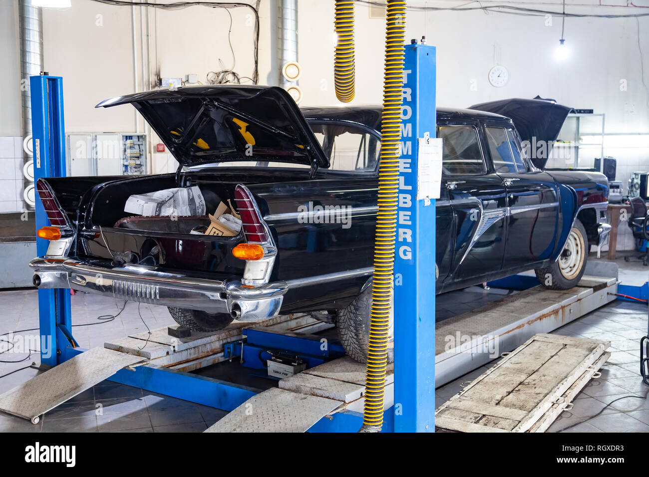 Russian Classic Vintage Car Part Of The History In A Repair Workshop In Good Condition In A Disassembled State Stands On A Viewing Pit And Lift Restor Stock Photo Alamy